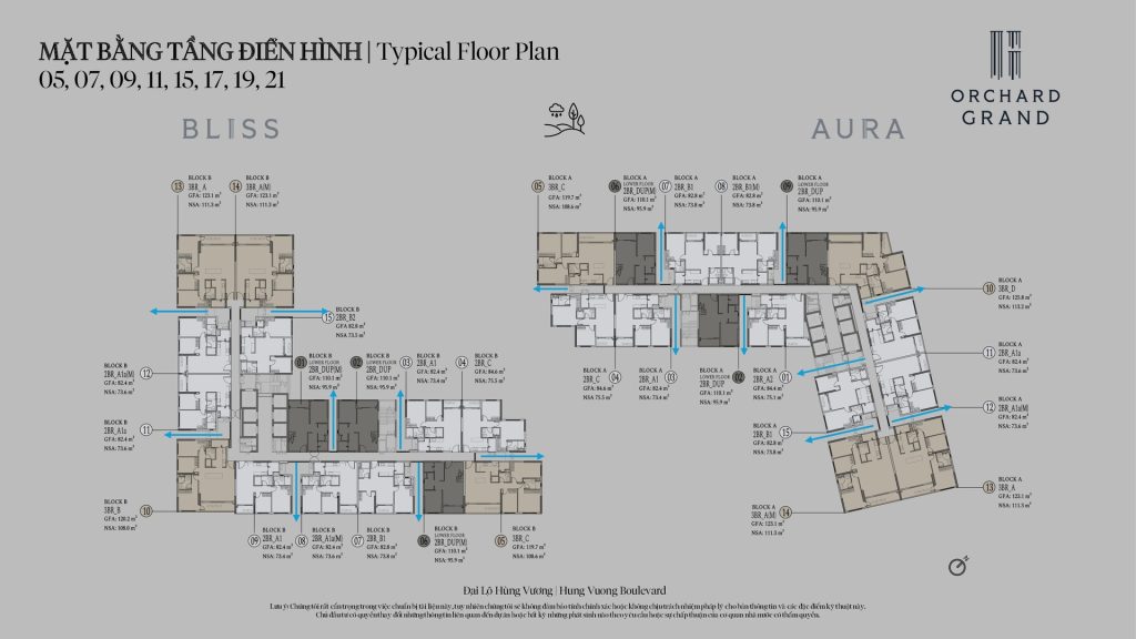 Orchard Grand cung cấp các loại hình căn hộ từ 2 phòng ngủ, 3 phòng ngủ, Duplex đến Penthouse, không phát triển căn 1 phòng ngủ nhằm đảm bảo mật độ cư dân lý tưởng và trải nghiệm sống cao cấp. Diện tích căn hộ dao động từ khoảng 75m² cho căn 2 phòng ngủ, 108-113m² cho căn 3 phòng ngủ, khoảng 96m² cho căn duplex và lên tới 275 – 495m² đối với các căn penthouse có sân vườn riêng và sky jacuzzi.